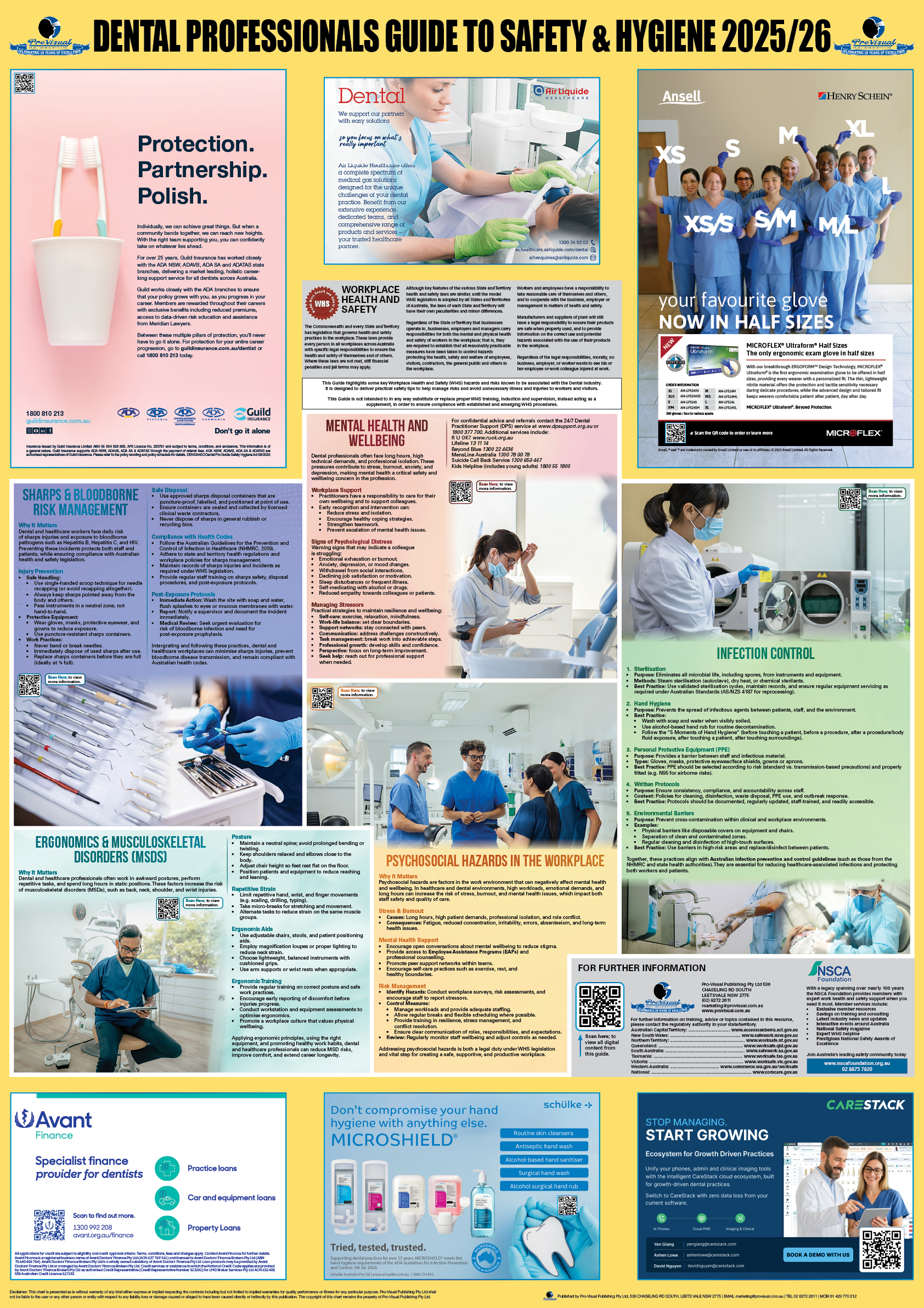The Guide covers key health and safety issues aimed at dental professionals, with this year’s edition covering topics on; Mental Health and Wellbeing, Managing Psychosocial Hazards at Work,Sharps & Bloodborne Risk Management, Infection Control, and Ergonomics & Musculoskeletal Disorders (MSDS).
